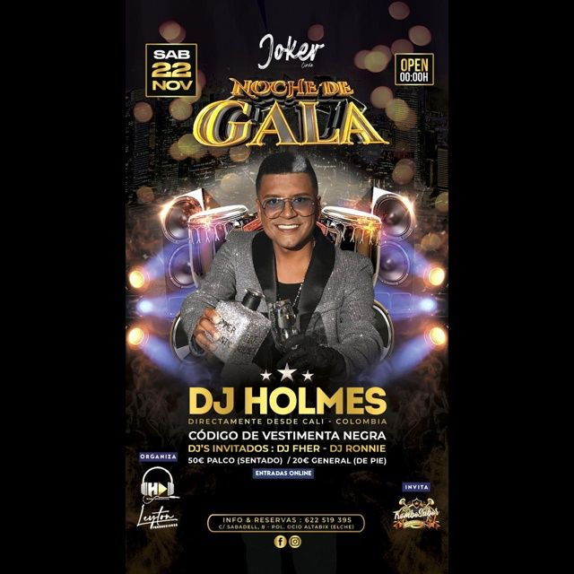 EVENTO: NOCHE DE GALAFECHA: SABADO 22 NOVIEMBREAPERTURA DE PUERTAS: 00:00LUGAR: JOKER, ELCHEdirectamente a Elche.¡DJ-Holmes llega con la mejor salsa romántica y un show que te hará vibrar!¡Elche, no te lo puedes perder!En JOKER: Calle Sabadell, 8, Polígono de Ocio Altabix, Elche.Boletos 100% digitales en biotickets.com COMPRAR